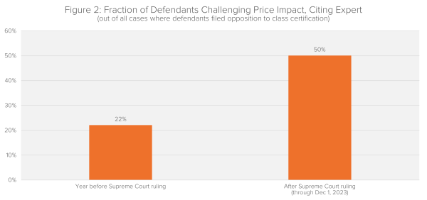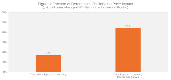 As Figure 1 and the table below show, defendants challenged price impact in 17% of the cases that reached the class certification stage in the year prior to the Supreme Court ruling. The corresponding number after the ruling is 44%, more than twice as high.10