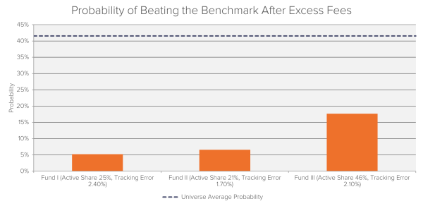 Fideres has developed a robust quantitative framework to identify closet index funds applying this approach. Part of this approach involves estimating the probability of a fund beating the benchmark after excess fees (over an actual index-tracking ETF) on the basis of the fund’s active share, tracking error, and portfolio holdings. When applied to a North American universe of funds, it can be seen that closet index funds are substantially less likely to beat the benchmark than actively-managed funds:
