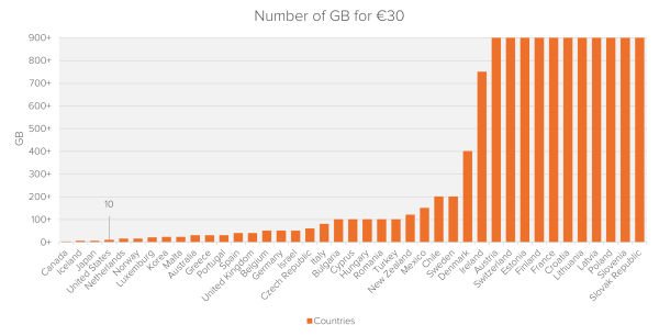 In a more direct comparison to 41 developed nations, the US market offered the 4th least amount of data for €30 (Rewheel, 2018).