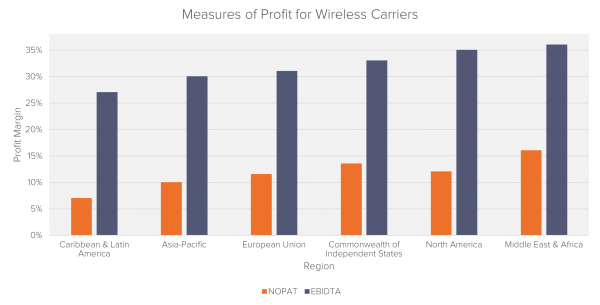 These higher revenues, however, do not appear to be converted into higher profits. For two accounting measures of profitability, EBITDA margin and NOPAT margin,1 the North American value is in line with its global counterparts.