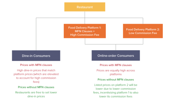 In the absence of MFN clauses, we would expect to see competition on commissions between platforms. Rival platforms would be incentivized to offer lower commissions, and monopoly platforms would have an incentive to cut their own commissions in order to match those offers and retain restaurants on their platforms. As a result, commissions across all restaurant platforms would fall and consumers would pay lower prices.