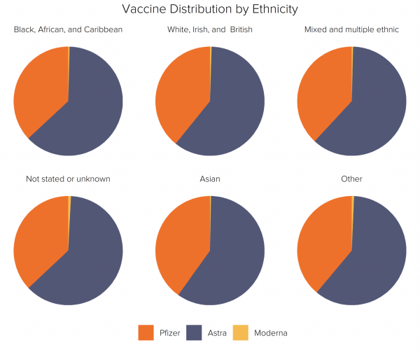 There is remarkably little variation in the proportion of each ethnic group receiving each vaccine type. Within all six ethnic categories, around 40% received the Pfizer vaccine and 60% were given AstraZeneca. Due to the late entry of the Moderna jab into the vaccine rollout, less than 1% of each ethnic group had received this jab by the end of May. It is important to note that this distribution was the same even within the category of people refusing to state their identity – many of which are likely to have belonged to ethnic minority groups.