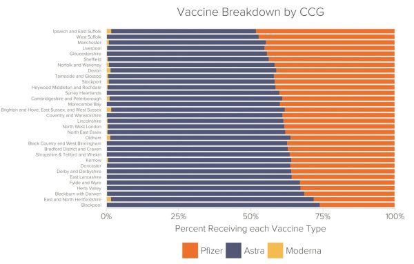 Notable outliers are NHS East and North Hertfordshire CCG and NHS Blackpool CCG. Within these CCG areas respectively, 70% and 74% of the vaccines administered were manufactured by AstraZeneca. A low 28% and 26% of their respective doses were made by Pfizer. However, these results appear to be anomalous rather than a symptom of regional discrimination in the NHS’ vaccine administration.