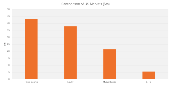 As of 2019, ETFs controlled $5.4tn in Assets Under Management (AUM) globally, with the US accounting for just over 70%. Though only a fraction of other more liquid markets, the ETF market is growing at a much faster rate. Bank of America estimates that ETF AUM will reach $50tn by 2030, which is the combined size of US equity and mutual funds markets today.
