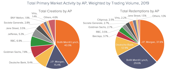 We find that only a handful of APs are actively redeeming or creating shares each year. In addition, our analysis indicates that the primary market is highly concentrated – the top three APs accounted for over 65% of all creations and 80% of all redemptions in 2019.