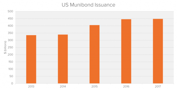 Outstanding Muni Bond debt in the United States numbers in the trillions of dollars ($3.8tn as of Q3 2017). The average daily trading volume of Muni Bonds between 2007 and 2017 was approximately $9bn. The chart below shows the volume of new Muni Bond issuance for the past five years.