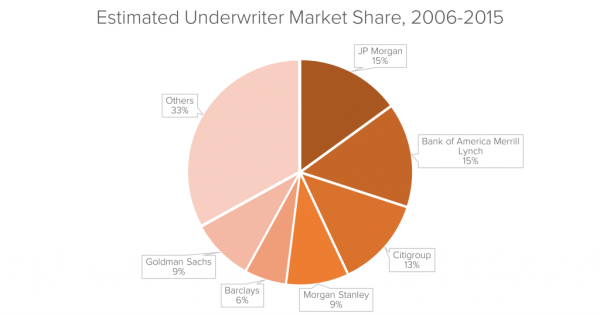 Unlike similar securities (such as US Treasuries), Muni Bonds are not priced in a competitive bidding process. Municipalities typically ‘outsource’ the pricing of their bonds to underwriters, who generally come from a small group of large banks. The chart below estimates underwriters’ market share, based on a sample of trade and issuance data for Muni Bonds provided by Bloomberg: