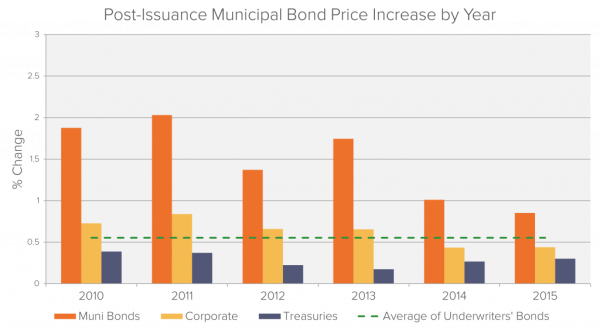 Issuers will typically price their bonds generously to attract investors, so it is normal for the price of newly listed securities to rise in the secondary market after they begin trading. Nevertheless, Fideres’s findings show that the price of Muni Bonds increases far more than securities in similar markets.
