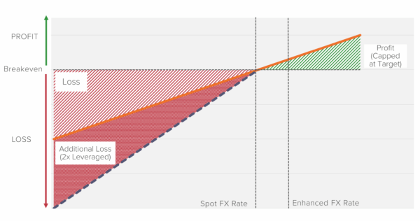 The diagram below shows the payoff of a TARF contract. If the enhanced rate is better than the spot rate, the investor profits—up to the target redemption amount. But if the spot rate falls below a set threshold, the investor must keep transacting at a loss. TARFs frequently use leverage. This makes losses more severe. Critically, if a TARF was used for hedging, hitting the target redemption cap early can leave the investor suddenly unhedged just when protection is most needed.