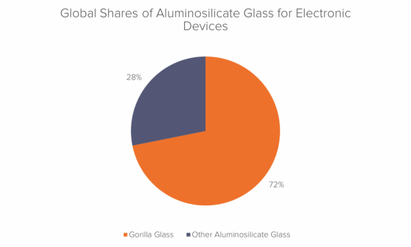 - Our analysis reveals Corning charges premium prices compared to competitors, while maintaining a dominant 72% market share in the aluminosilicate glass market for electronic devices.