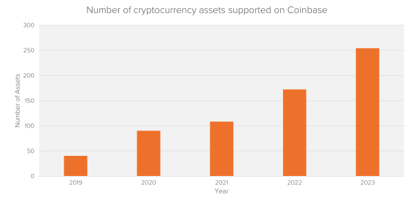 In the graphs below, the average number of monthly users active on Coinbase increased from 900,000 in 2019 to 9 million in 2021. At the same time, the increase in the number of users in 2020 saw a parallel increase in the number of available assets on the platform, which more than doubled from 2019 to 2020.