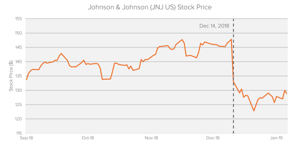 This example shows the effect on option positions particularly clearly. In December 2018, Reuters reported that “Johnson & Johnson knew about asbestos in its baby powder for decades”.4 JNJ share price dropped precipitously as soon as the news broke: