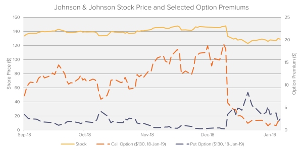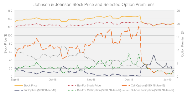 Bloomberg lists 7760 different available/traded option contracts for Johnson & Johnson in December 2018. The following chart shows the price changes for two exemplary options that are both liquidly traded and significantly affected by the observed price drop in the stock: