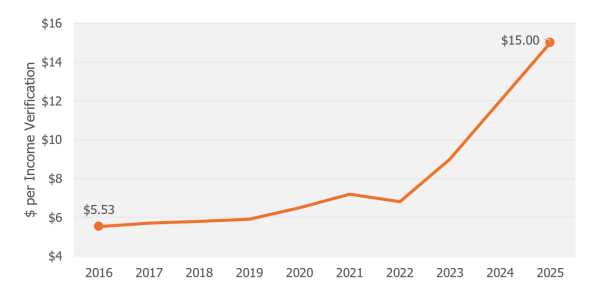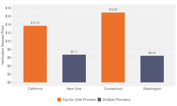 In 2024, New York paid $6.71 per income verification request. California, a similarly high-volume state in which Equifax was the sole provider, paid $13.70 per request. In lower-volume states, the pattern was similar. Washington paid $6.44 per request, compared with $16.92 in Connecticut, where Equifax was the sole provider.