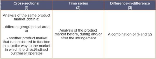 Comparator-based methods involve analysing the prices set by the direct purchaser during the infringement period and the prices set in similar markets. Qualitative evidence such as internal documents that reveal key information about pricing decisions may also be relevant, but in terms of quantitative evidence, the EC has identified that regression analysis is the best technique for courts to rely on.