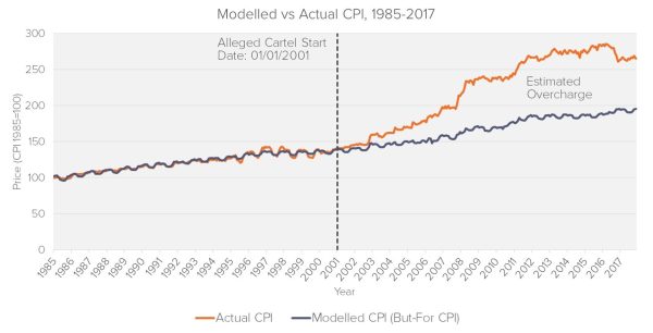 By mapping within-nation CPI and PPI data, we use regression analysis to predict but-for prices that would have otherwise been paid by indirect consumers to the direct purchaser (“But-For” CPI) by accounting for the cartelised input cost (PPI). We can then estimate these model parameters to ascertain pass-on in different sectors and sub-sectors of product categories, according to levels of the supply chain that were affected. To bolster the standardized regression model, we can also add market-specific demand, supply and structural factors to create a sophisticated but-for model. Examples include quantities demanded and supplied; imports and exports; exchange rates; raw material costs; prices of substitutes and inflation.