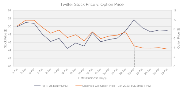 On April 25, 2022, the board of Twitter approved of an acquisition offer by Elon Musk to take the company private. In the aftermath of the announcement, Twitter’s share price rallied due to resulting investor excitement. All else equal, this price spike should have caused the value of call options (options to buy) to increase – as the same option now allows the holder to buy something more expensive. However, as shown in the chart below, call options prices decreased instead.