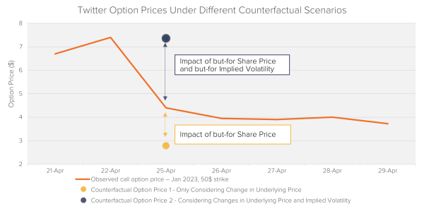 Ignoring implied volatility can have grave consequences when determining the magnitude and directionality of damages for option holders, which may lead to challenges during class certification. To illustrate this point, we briefly analyze the movement of option prices following an announcement by Twitter from April 2022 and the impact this announcement had on option holders.