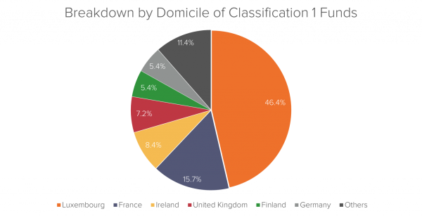 Earlier this month, a Financial Times article stated that the French regulator concluded “that no French asset manager is offering so-called closet trackers — funds that follow an index closely but charge high fees for active management”.7 However, Fideres’s study suggests that approx. 15.7% of the Classification 1 funds are domiciled in France.