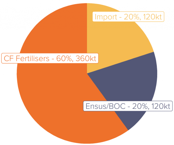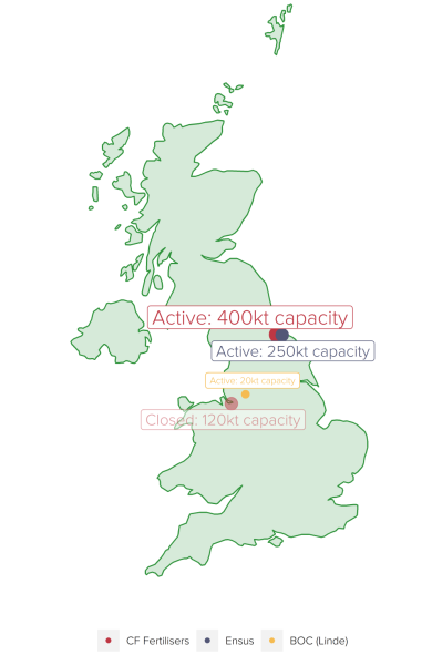 In August of this year, CF Fertilisers announced a temporary halt in its Teesside facility, which is the industry’s single largest manufacturing site.3 This came just two months after CF Fertilisers announced the complete closure of its Ince facility in Cheshire, which previously accounted for 15% of industry capacity. This left only three production sites operating in the UK:
