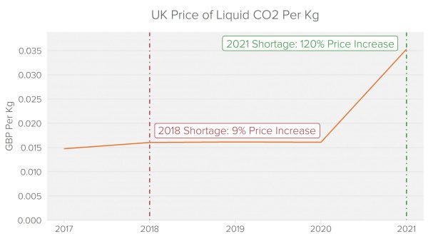 The 2021 shortage wasn’t the first either. In 2018, there was a shortage so severe that it prompted a full report from the Food and Drink Federation. Some described the 2018 shortage as a “perfect storm” spurred by increasing demand following a heat wave and England’s almost unprecedented success at the World Cup – while unexpected breakdowns at key plants in the UK disrupted supply. However, the FDF cautioned against such simplistic explanations:
