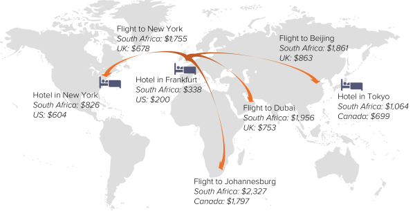 • We matched the exact flight details and hotel booking details from these different locations to identify prices charged for the same services in a variety of countries.