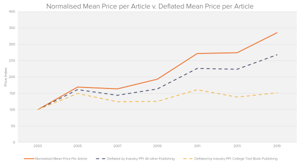 These plus factors are accompanied by other market characteristics that suggest inflated pricing in the sector. The mean price per article across all subject disciplines increased by 134% over the period 2003-2019, particularly 22% between 2013-2019. We observe significant price increases even after adjusting for relevant producer price indices (“PPIs”) related to publishing.