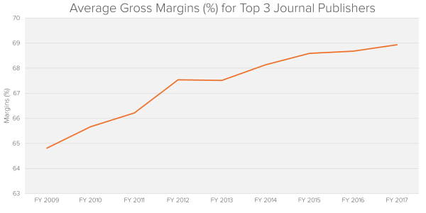 Given the above factors, it is unsurprising that publishers consistently report high profit margins. The average gross margins of the three publicly traded publishing companies is shown below. These margins have stayed above 64% and has consistently increased over the years between 2009-2017.
