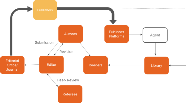 When an author wants to publish an article, they submit it to journal editors, who coordinate the peer-review process and get the article ready for publishing with the journal publisher. The publisher either directly or indirectly (through agents) sells the journal to libraries, who make it available to the readers. There are mainly two types of journals – open access journals, where publishers provide the articles free of charge, and regular journals paid by subscription. In most cases, open access journals charge a publication fee to the authors.