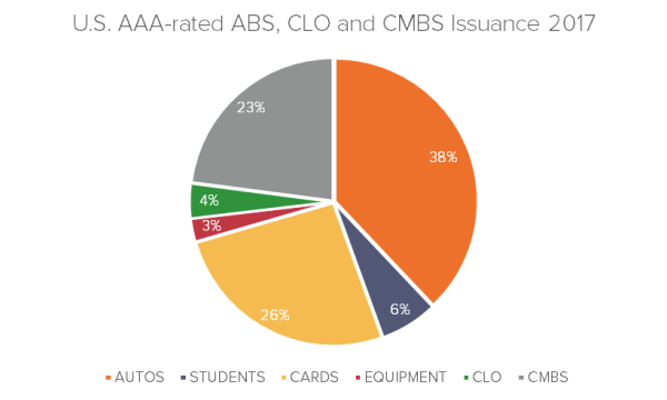 Though issuance of structured finance products has decreased significantly after the financial crisis, there has been a steady increase towards pre-crisis levels over the last few years. Total S&P AAA-rated ABS, CLO and CMBS issuance in the U.S. was approximately $125bn in 2017, an increase of nearly $40bn on the previous year.7
